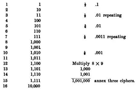 involved, but the symbols are given by combination of the symbols for 1 to 9, with the symbol for zero. As our development will show the symbol for nothing was the great stumbling block in the development of a scientific method of writing the numerals. A place system to the base five would require only the addition of a symbol for zero to the symbols for 1, 2, 3 and 4. Leibnitz occupied himself with the binary system, as this required only two characters, one for unity and one for non-entity. To illustrate a binary place system the numbers from 1 to 16 are written, using only 1 and 0.