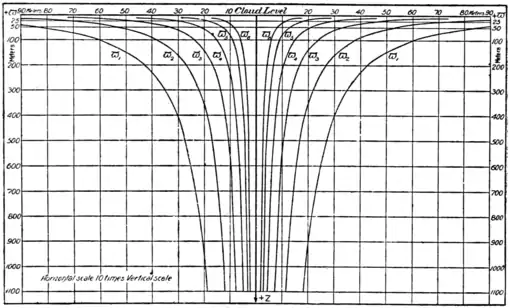 through the funnel-shaped vortex, and shows the boundary of the several vortex tubes. The horizontal dimensions are multiplied by ten for the sake of showing the relative dimensions more plainly which exist from one tube to another. It will be noted that the distances between the successive tubes get smaller and smaller in a geometric ratio towards the axis. They concentrate at the lower part, and expand so that the lines become parallel to a horizontal plane in a region at