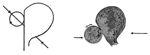 Let us now consider the effect of a cross-wind. Suppose the wind is blowing from left to right, then, if the ball is pulled, it will be rotating in the direction shown in Fig. 26; the rules we found for the effect of rotation on the difference of pressure on the two sides of a ball in a blast of air show that in this case the pressure on the front half of the ball will be greater than that on the rear half, and thus tend to stop the flight of the ball. If, however, the spin was
