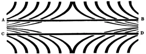 Fig. 2. The lines AB and CD are straight, as may be seen by viewing the figure from one side with the eye close to the paper. They are In the same plane and will never meet. Yet by an optical illusion we here obtain within a small compass the same appearance as would be furnished by two parallels to an eye located In Lobachevski's space and capable of surveying a tremendous stretch of the parallels from a very great distance. The diagram probably has no reference whatever to non-Euclidean geometry. It elucidates mental, not physical, phenomena.