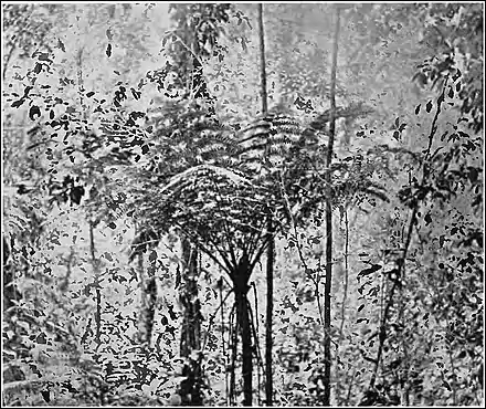 Two things are noteworthy in comparing tropical forests with those of colder regions: the diversity of the vegetation, and the intensity of the struggle for existence. In the temperate or frigid regions of the earth which are forested we are accustomed to see one species or genus of trees dominate all other plants and become a "climax forest," e. g., oak, pine, spruce, beech forests. But in the tropics conditions are favorable for many species; the growing season is always good, and the forest is always varied. Tree ferns, palms, vines, deciduous trees, epiphytes, mosses, ferns—all grow in riotous confusion. Vines climb over great
