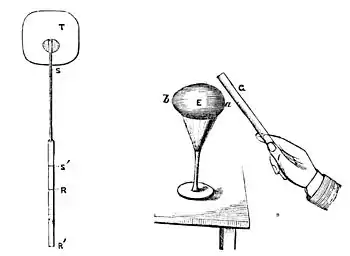 Touch your rubbed glass rod with T, and then touch your electroscope: the leaves diverge with positive electricity. Touch your rubbed gutta-percha or sealing-wax with T, and then touch your electroscope: the leaves diverge with negative electricity. If the electricity of any body augment the divergence produced by the glass, the electricity of that body is positive. If it augment the divergence produced by the gutta-percha, the electricity is negative. And now we are ready for further work.