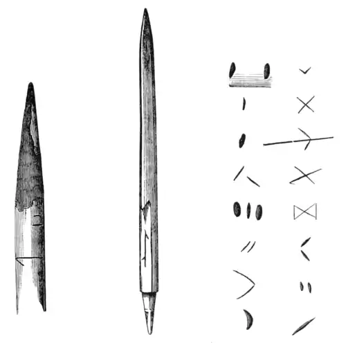 Many of the arrows had owners' marks on them (figs. 1 and 3) resembling those on the modern Esquimaux arrows (fig. 2). The Nydam swords also bear seven inscriptions; three of them are illegible, the others are "ricus," "riccim," "cocillus," and "umored." On the