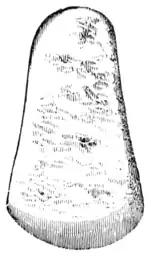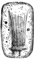 Fig. 12.—Half of a celt mould from Ireland. It is of mica slate, 634 inches long, 4 wide, and presents upon the surface the apertures by means of which it was adjusted by the other half.