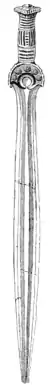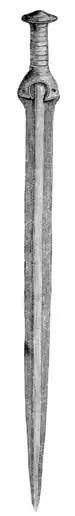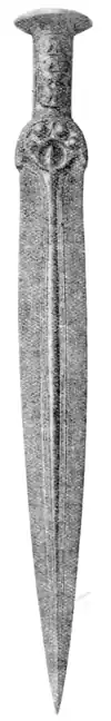 | Fig. 31.—Sword from Denmark, found in the Treenhoi tumulus. | Fig. 32.—Bronze sword, Stockholm. | Fig. 33.—Sword from Denmark, one-sixth of the actual size. |