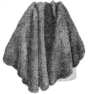 Fig. 73.—A woollen cape, one-sixth of the actual size. Found with the preceding. Pliny attributes the invention of cotton weaving to the reign of Semiramis. In one of the wall paintings at Benihassan on the Nile (about 2100 B.C.), a figure is represented in a spotted dress—apparently woven with a shuttle. On another tomb at Thebes, a personage is represented in a dress with red and blue spots, which, however, may have been darned on. On a wall painting in the Ramesseum (about 1400 B.C.) an Egyptian being is represented in a dress striped with blue and yellow, while his horse carries a cloth striped with blue, yellow, red, and green. Herodotus describes a corselet sent as a present by Amasis to the Greeks as being of linen with "many figures of animals unwrought, and adorned with gold and tree wool."