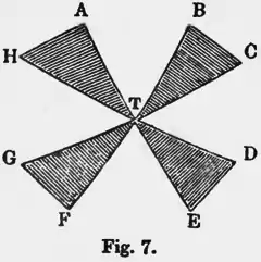 But if the two sheets, constructed for the temperature and pressure of the coexistent phases which have the same composition, intersect at the point of contact, the whole primitive surface as seen from below will in general present four re-entrant furrows, radiating from the point of contact, for each of which a developable surface may be formed by a rolling double tangent plane. The different parts of the surface of dissipated energy in the vicinity of the point of contact are represented in figure 7. are parts of one sheet of the primitive surface, and are parts of the other. These are united by the developable surfaces