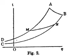 - ↑ In neither diagram do these circumstances create any serious difficulty in the estimation of areas representing work or heat. It is always possible to divide these areas into two parts, of which one is of finite dimensions, and the other can be calculated in the simplest manner. Thus in the entropy-temperature diagram the work done in a path (fig. 2) is represented by the area included by the path , the isometric , the line of no pressure and the isometric . The line of no pressure and the adjacent parts of the isometrics in the case of an actual gas or vapor are more or less undetermined in the present state of our knowledge, and are likely to remain so; for an ideal gas the line of no pressure coincides with the axis of abscissas, and is an asymptote to the isometrics. But, be this as it may, it is not necessary to examine the form of the remoter parts of the diagram. If we draw an isopiestic , cutting and , the area , which represents the work done in , will be equal to , where denotes the pressure in and and denote the volumes at and respectively (eq. 5). Hence the work done in will be represented by . In the volume-pressure diagram, the areas representing heat may be divided by an isothermal, and treated in a manner entirely analogous.Or we may make use of the principle that, for a path which begins and ends on the same isodynamic, the work and heat are equal, as appears by integration of equation (1). Hence, in the entropy-temperature diagram, to find the work of any path, we may extend it by an isometric (which will not alter its work), so that it shall begin and end