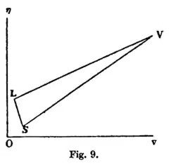 Let the temperature and the pressure of the mixture, which are independent of the proportions of vapor, solid and liquid, be denoted by and . Also let and (fig. 9) be points of the diagram which indicate the volume and entropy of the body in three perfectly defined states, viz: that of a vapor of temperature and pressure , that of a liquid of the same temperature and pressure, and that of a solid of the same temperature and pressure. And let denote the volume and entropy of these states. The position of the point which represents the body, when part is vapor, part liquid, and part solid, these parts being as , and , is determined by the equations
