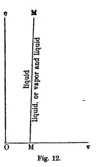 It may occur, however, in the volume-entropy diagram, that the same point must represent two different states of the body. This occurs in the case of liquids which can be vaporized. Let (fig. 12) be the line representing the states of the liquid bordering upon vaporization. This line will be near the axis of entropy, and nearly parallel to it. If the body is in a state represented by a point of the line , and is compressed without addition or subtraction of heat, it will remain of course liquid. On the other hand, the body being in the original state, if its volume should be increased without addition or subtraction of heat, and if the conditions necessary for vaporization are present (conditions relative to the body enclosing the liquid in question, etc.), the liquid will become partially vaporized, but if these conditions are not present, it will continue liquid. Hence, every point on the right of and sufficiently near to it represents two different states of the body, in one of which it is partially vaporized, and in the other it is entirely liquid. If we take the points as representing the mixture of vapor and liquid, they form one diagram, and if we take them as representing simple liquid, they form a totally different diagram superposed on the first. There is evidently no continuity between these diagrams except at the line ; we may regard them as upon separate sheets united only along . For the body cannot pass from the state of partial vaporization to the state of liquid except at this line. The reverse process is indeed possible; the body can pass from the state of superheated liquid to that of partial vaporization, if the conditions of vaporization alluded to above are supplied, or if the increase of volume is carried beyond a certain limit, but not by gradual changes or reversible processes. After such a change, the point representing the state of the body will be found in a different position from that which it occupied before, but the change of state cannot be properly represented by any path, as during the change the body does not satisfy that condition of uniform temperature and pressure which has been assumed throughout this article, and which is necessary for the graphical methods under discussion. (See note on page 1.)