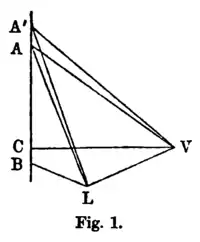 From these relations may be deduced by simple geometrical considerations one of the principal propositions in regard to such compounds. Let the tangent plane touch the primitive surface at the two points and (fig. 1), which, to fix our ideas, we may suppose to represent liquid and vapor; let planes pass through these points perpendicular to the axes of and respectively, intersecting in the line , which will be parallel to the axis of . Let the tangent plane cut this line at , and let and be drawn at right angles to and parallel to the axes of and . Now the pressure and temperature represented by the tangent are evidently and respectively, and if we suppose the tangent plane in rolling upon the primitive surface to turn about its instantaneous axis an infinitely small angle, so as to meet in , and will be equal to and respectively. Therefore,