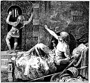 Then Gudrun was very angry, and said that it was Sigurd, not Gunnar, who had ridden the flame, and had received from Brynhild that fatal ring, the ring of the dwarf Andvari.