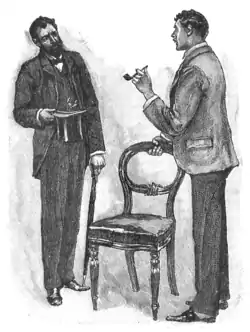 "And now I come to the queer part of the business. I was in diggings out Hampstead way—17, Potter's Terrace, was the address. Well, I was sitting doing a smoke that very evening after I had been promised the appointment, when up came my landlady with a card which had 'Arthur Pinner, financial agent,' printed upon it. I had never heard the name before, and could not imagine what he wanted with me, but of course I asked her to show him up. In he walked-a middle-sized, dark-haired, dark-eyed, black-bearded man, with a touch of the sheeny about his nose. He had a brisk kind of way with him and spoke sharply, like a man that knew the value of time.