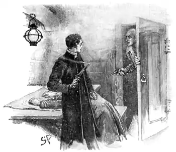 "The state-room was next the cabin, and we flocked in there and flopped down on the settees, all speaking together, for we were just mad with the feeling that we were free once more. There were lockers all round, and Wilson, the sham chaplain, knocked one of them in, and pulled out a dozen of brown sherry. We cracked off the necks of the bottles, poured the stuff out into tumblers, and were just tossing them off, when in an instant, without warning, there came the roar of muskets in our ears, and the saloon was so full of smoke that we could not see across the table. When it cleared away again the place was a shambles. Wilson and eight others were wriggling on the top of each other on the floor, and the blood and the brown sherry on that table turn me sick now when I think of it. We were so cowed by the sight that I think we should have given the job up if it had not been for Prendergast. He bellowed like a bull and rushed for the door with all that were left alive at his heels. Out we ran, and there on the poop were the lieutenant and ten of his men. The swing skylights above the saloon table had been a bit open, and they had fired on us through the slit. We got on them before they could load, and they stood to it like men, but we had the upper hand of them, and in five minutes it was all over. My God! was there ever a slaughterhouse like that ship? Prendergast was like a raging devil, and he picked the soldiers up as if they had been children and threw them overboard, alive or dead. There was one sergeant that was horribly wounded, and yet kept on swimming for a surprising time, until someone in mercy blew out his brains. When the fighting was over there was no one left of our enemies except just the warders, the mates, and the doctor.