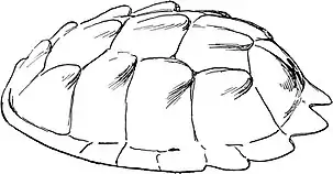 Length, eight inches; dark reddish-brown, with oyster-shell-like embossed lines; yellow-orange beneath, each plate having a black blotch in the outside corner.