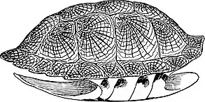 Length, four inches; similar to No. 1; head with lighter spots; shield smooth, and shows no backbone ridge; no teeth on hind edge; lower shield large, and can close the shell with it.