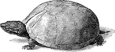 Length, six inches; black, head with two yellow stripes on each side; shield smooth, but shows ridge of back bone, yellowish underneath. Emits a strong odor of musk.