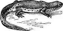 Length, three-and-one-half inches; greenish or reddish-brown; light-yellow underneath; row of red dots on sides, and small black dots on belly; tail, flat. Aquatic.
