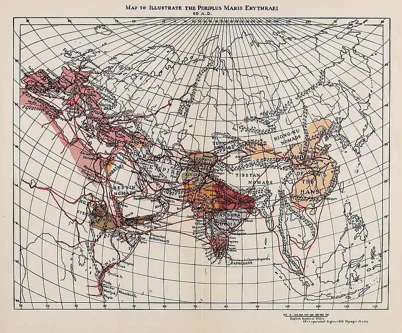 51. Among the market-towns of Dachinabades there are two of special importance; Paethana, distant about twenty days' journey south from Barygaza; beyond which, about ten days' journey east, there is another very great city, Tagara. There are brought down to Barygaza from these places by wagons and through great tracts without roads, from Paethana carnelian in great quantity, and from Tagara much common cloth, all kinds of muslins and mallow cloth, and other merchandise brought there locally from the regions along the sea-coast. And the whole course to the end of Damirica is seven thousand stadia; but the distance is greater to the Coast Country.