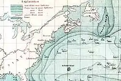 16. The power necessary to overcome the resistance opposed to such a body of water as that of the Gulf Stream, running several thousand miles without any renewal of impulse from the forces of gravitation or any other known cause, is truly surprising. It so happens that we have an argument for determining, with considerable accuracy, the resistance which the waters of this stream meet with in their motion toward the east. Owing to the diurnal rotation, they are carried around with the earth on its axis toward the east with an hourly velocity of one hundred and fifty-seven[6] miles greater when they enter the Atlantic than when they arrive off the Banks of Newfoundland. In consequence of the difference of latitude between the parallels of these two places, their rate of motion around the axis of the earth is reduced from nine hundred and fifteen[7] to seven hundred and fifty-eight miles the hour.