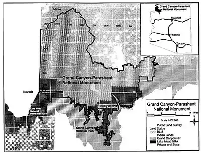 Now, Therefore, I, William J. Clinton, President of the United States of America, by the authority vested in me by section 2 of the Act of June 8, 1906 (34 Stat. 225, 16 U.S.C. 431), do proclaim that there are hereby set apart and reserved as the Grand Canyon-Parashant National Monument, for the purpose of protecting the objects identified above, all lands and interests in lands owned or controlled by the United States within the boundaries of the area described on the map entitled "Grand Canyon-Parashant National Monument" attached to and forming a part of this proclamation. The Federal land and interests in land reserved consist of approximately 1,014,000 acres, which is the smallest area compatible with the proper care and management of the objects to be protected.