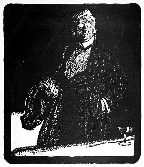 The men around the table turned and glanced toward the gentleman in front of the fireplace. He was an elderly and somewhat portly person, with a kindly, wrinkled countenance, which wore continually a smile of almost childish confidence and good-nature. It was a face which the illustrated prints had made intimately familiar. He held a book from him at arm's-length, as if to adjust his eyesight, and his brows were knit with interest.