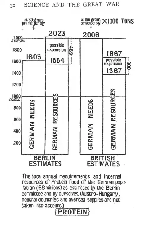 Germany is in a far more serious position as regards the supply of protein than of energy-producing foods, so that we need not further consider these latter. Eltzbacher contends that the quantities represented on the left-hand side of the diagram on p. 30 are a true statement of German protein needs and the means for more than meeting them. He claims that the yearly needs (1,605,000 tons) for the 68,000,000 people are very nearly met by existing resources (1,554,000 tons), and that it will be possible by special efforts to increase the resources to more than 2,000,000 tons. The data on which these conclusions are based have been subjected to a searching examination by Dr. A. D. Waller, Professor of Physiology in the University of London, and Professor W. J. Ashley, holding the Chair of Commerce in Birmingham University. These authorities concur in the opinion that the German case is stated far too optimistically. Dr. Waller's conclusions are represented on the right-hand side of the diagram on p. 30 prepared by him and kindly lent to me for reproduction.[11] It is unnecessary to quote the figures, which are clearly shown, but it will be seen that Dr. Waller believes that the German needs were greatly underestimated, the resources as well as the means of extending them greatly overestimated by Eltzbacher. Professor Ashley, in a critical examination of the data in the Quarterly Review for October, comes to the same conclusion. It is only necessary to mention here the principal criticism, although there are many others. The