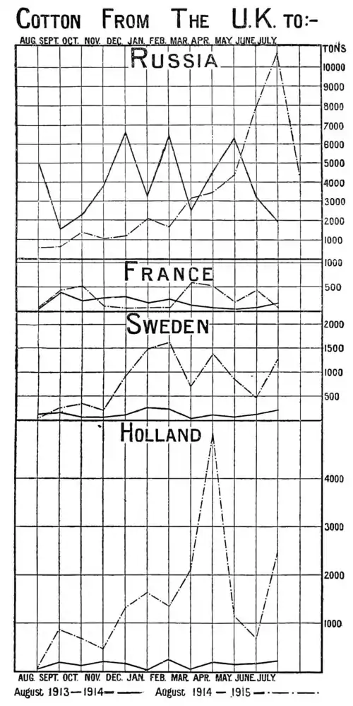 The Marquess of Crewe, in replying to Lord Charnwood's question about cotton, is reported to have said 'it would naturally not do to assume that no substitute, even if less convenient, can be found in all cases. I do not say that to minimize the importance of keeping raw cotton and cotton-waste out of Germany, but I do not go so far as my noble friend in speaking of its necessity.'[6]