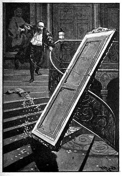 Once, as he worked, a curious fit of terror seized upon him. A great picture, whose cord had been rotted by age, fell on the staircase just as he was about to descend with his last bag of gold. So startling was the crash, echoing in the lonely house, that he dropped the bag he was carrying and the golden coins went rolling down the stairs. He picked them up with quivering fingers, not unwilling to linger there. For he feared the darkness of the cellar; it was like a tomb, he thought. All his courage could not bring him to face it readily.