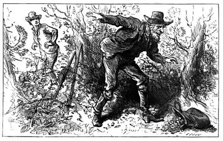 The squatter did not think it necessary to finish the sentence. He stopped, took his ready knife from his pocket and looked around for a switch. This alarmed Sam, who made haste to assure his father that he had the bearings of the hiding-place of the valises firmly fixed in his memory, and that he could go to it without the least difficulty.