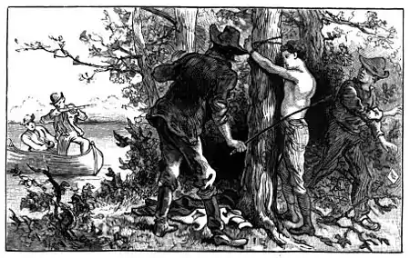 When we rounded the point we were within less than thirty yards of our camp, and in plain sight of it; But its occupants were so deeply interested in their own affairs that they did not see us. I felt a thrill of indignation run all through me when I caught a glimpse of my master's pale face, and was proud of him when T saw that there were no signs of cringing in him. Matt bared his brawny arm clear to the shoulder, caught up a switch, gave it a flourish or two to make sure that it would stand the work to which he intended to put it, and then said in a loud voice, as if he were addressing some one on the other side of the spring-hole: