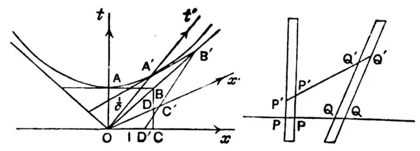 I will now show with our figure that the hypothesis of Lorentz is fully equivalent to the new conception of space and time by means of which it becomes much more understandable. For the sake of simplicity let us not reflect upon and , and let us imagine to ourselves a spacially one-dimensional world. Then a strip perpendicular like the -axis and a strip inclined to the -axis are respectively the images of the course of a body at rest and of that of a body in uniform motion; each of these bodies retaining a constant spacial extension. If is parallel to the second strip, we may introduce as the co-ordinate of time and as the co-ordinate of space, and then the second body appears to be at rest and the first to be in uniform motion. We suppose now that the first body conceived to be at rest has the length ; in other words, the section of the first strip on the -axis is equal to , where represents the unit of measure on the -axis. Again we suppose that the second body conceived to be at rest has the same length ; in other words, the cross-section of the second strip parallel to the -axis, i.e., , is equal to . We have now these two bodies as images of two equal Lorentzian electrons, one at rest and the other in uniform motion. However, if we retain the original co-ordinates , then the extension of the second electron is to be considered to be , the section of the corresponding strip parallel to the axis of . Now, it is evident that since . An easy calculation shows that, if represent the for the second strip,
