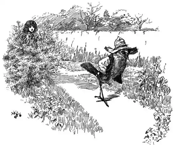Being in a garden full of flowers at Christmas-time is a very fine thing; and Dorothy was looking about with great delight, and wondering how it had all happened, when she suddenly caught sight of a big robin walking along one of the paths, and examining the various plants with an air of great interest. He was a very big robin, indeed—in fact, he was about as large as a goose; and he had on a gardener’s hat, and a bright red waistcoat which he was wearing unbuttoned so as to give his fat little chest plenty of room; but the most remarkable thing about him was that he was walking about with his hands in his waistcoat-pockets.