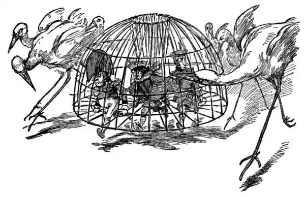 The cage proved to be an enormous rat-trap, and the Caravan, with remarkable presence of mind, had put their legs through between the wires at the bottom of it, and were walking briskly along, holding up the cage with their hands. The news of this extraordinary performance had evidently been spread abroad, as the Ferryman and a number of serious-looking storks were escorting the Caravan with an air of great interest, and occasionally taking to their heels when the Admiral chanced to look at them through the wires with his spy-glass. There was a door, to be sure, in the side of the trap, quite big enough for the Admiral, and Sir Walter, and the Highlander to come out of, all in a row if they liked, but they evidently hadn’t noticed this—“and I’m not going to tell ’em about it, just yet,” said Dorothy to herself, “because they deserve to be punished for their capers. But it’s really quite clever of ’em to put their little legs through in that way,” she went on, “and extremely convenient—that is, you know,” she added thoughtfully, “so long as they all want to go the same way”; and, with this wise reflection, she scrambled over the wall and ran after the procession.