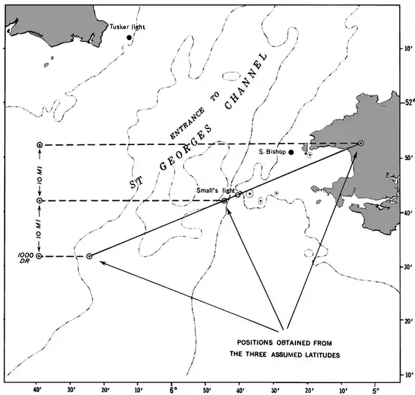 - Having sailed from Charleston, S. C., 25th November, 1837, bound to Greenock, a series of heavy gales from the Westward promised a quick passage; after passing the Azores, the wind prevailed from the Southward, with thick weather; after passing Longitude 21° W, no observation was had until near the land; but soundings were had not far, as was supposed, from the edge of the Bank. The weather was now more boisterous, and very thick; and the wind still Southerly; arriving about midnight, 17th December, within 40 miles, by dead reckoning, of Tusker light; the wind hauled SE, true, making the Irish coast a lee shore; the ship was then kept close to the wind, and several tacks made to preserve her position as nearly as possible until daylight; when nothing being in sight, she was kept on ENE under short sail, with heavy gales; at about 10 AM an altitude of the Sun was observed, and the Chronometer time noted; but, having run so far without any observation, it was plain the Latitude by dead reckoning was liable to error, and could not be entirely relied on. Using, however, this Latitude, in finding the Longitude by Chronometer, it was found to put the ship 15' of Longitude E from her position by dead reckoning; which in Latitude 52°Nis 9 nautical miles; this seemed to agree tolerably well with the dead reckoning; but feeling doubtful of the Latitude, the observation was tried with a Latitude 10' further N, finding this placed the ship ENE 27 nautical miles, of the former position, it was tried again with a Latitude 20' N of the dead reckoning; this also placed the ship still further ENE, and still 27 nautical miles further; these three positions were then seen to lie in the direction of Small’s light. It then at once appeared that the observed altitude must have happened at all the three points, and at Small’s light, and at the ship, at the same instant of time; and it followed, that Small’s light must bear ENE, if the Chronometer was right. Having been convinced of this truth, the ship was kept on her course, ENE, the wind being still SE., and in less than an hour, Small’s light was made bearing ENE 1/2 E, and close aboard.