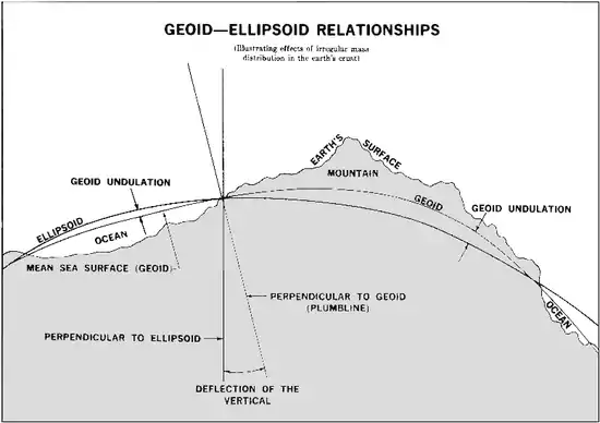 Figure 201. Geoid, ellipsoid, and topographic surface of the Earth, and deflection of the vertical due to differences in mass.