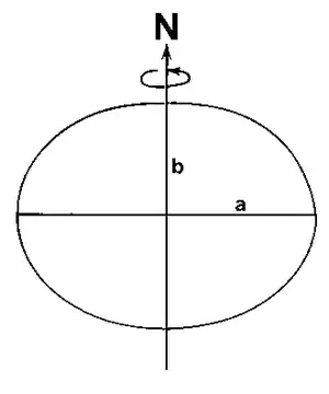 Figure 202. An ellipsoid of revolution, with semimajor axis (a), and semiminor axis (b).