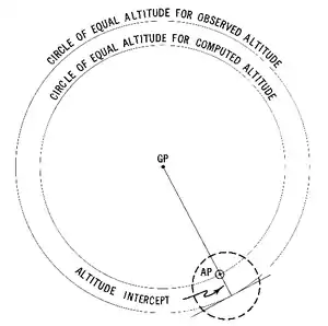 To plot an LOP, plot the assumed position on either a chart or a plotting sheet. From the Sight Reduction Tables, determine: 1) the altitude of the body for a sight taken at the AP and 2) the direction from the AP to the GP. Then, determine the difference between the body’s calculated altitude at this AP and the body’s measured altitude. This difference represents the difference in radii between the equal altitude circle passing through the AP and the equal altitude circle passing through the actual position. Plot this difference from the AP either towards or away from the GP along the axis between the AP and the GP. Finally, draw the circle of equal altitude representing the circle with the body’s GP at the center and with a radius equal to the distance between the GP and the navigator’s actual position.