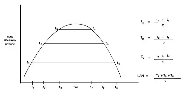 See Figure 2011. For about 30 minutes before the estimated time of LAN, measure and record several sextant altitudes and their corresponding times. Continue taking sights for about 30 minutes after the Sun has descended from the maximum recorded altitude. Increase the sighting frequency near the meridian passage. One sight every 20-30 seconds should yield good results near meridian passage; less frequent sights are required before and after. Plot the resulting data on a graph of sextant altitude versus time and draw a fair curve through the plotted data. Next, draw a series of horizontal lines across the curve formed by the data points. These lines will intersect the faired curve at two different points. The x coordinates of the points where these lines intersect the faired curve represent the two different times when the Sun’s altitude was equal (one time when the Sun was ascending; the other time when the Sun was descending). Draw three such lines, and ensure the lines have sufficient vertical separation. For each line, average the two times where it intersects the faired curve. Finally, average the three resulting times to obtain a final value