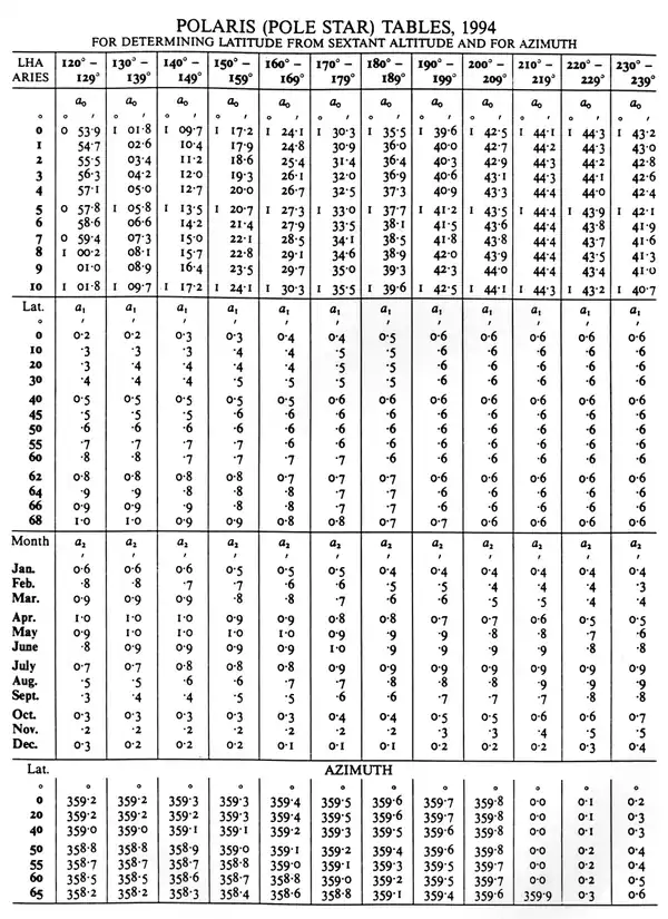 where ho is the sextant altitude (hs) corrected as in any other star sight; 1° is a constant; and A0, A1, and A2 are correction factors from the Polaris tables found in the Nautical Almanac. These three correction factors are always positive. One needs the following information to enter the tables: LHA of Aries, DR latitude, and the month of the year. Therefore: