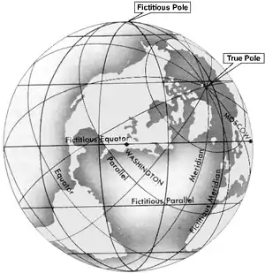Constructing a chart using Mercator principles, but with the cylinder tangent along a meridian, results in a transverse Mercator or transverse orthomorphic projection. The word “inverse” is used interchangeably with “transverse.” These projections use a fictitious graticule similar to, but offset from, the familiar network of meridians and parallels. The tangent great circle is the fictitious equator. Ninety degrees from it are two fictitious poles. A group of great circles through these poles and perpendicular to the tangent great circle are the fictitious meridians, while a series of circles parallel to the plane of the tangent great circle form the fictitious parallels. The actual meridians and parallels appear as curved lines.