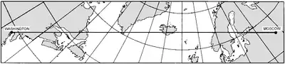 Figure 309d. An oblique Mercator map based upon a cylinder tangent along the great circle through Washington and Moscow. The map includes an area 500 miles on each side of the great circle. The limits of this map are indicated on the Mercator map of Figure 309c.