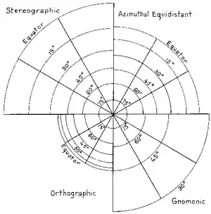 Figure 303. Azimuthal projections: A, gnomonic; B, stereographic; C, (at infinity) orthographic.