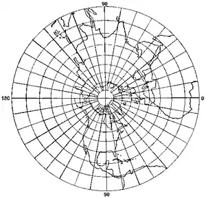 The simplest case of the azimuthal projection is one in which the plane is tangent at one of the poles. The meridians are straight lines intersecting at the pole, and the parallels are concentric circles with their common center at the pole. Their spacing depends upon the method used to transfer points from the earth to the plane.