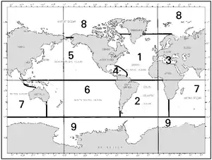 Two- and three-digit numbers are assigned to those small-scale charts which depict a major portion of an ocean basin or a large area. The first digit identifies the applicable ocean basin. See Figure 343a. Two-digit numbers are used for charts of scale 1:9,000,000 and smaller. Three-digit numbers are used for charts of scale 1:2,000,000 to 1:9,000,000.