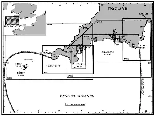 The Chart Information Graphic, the first item in each sector, is a graphic key for charts pertaining to that area. See Figure 403b. The graduation of the border scale of the chartlet enables navigators to identify the largest scale chart for a location and to find a feature listed in the Index-Gazetteer. These graphics are not maintained by Notice to Mariners; one should refer to the chart catalog for updated chart listings. Other graphics may contain special information on anchorages, significant coastal features, and navigation dangers.