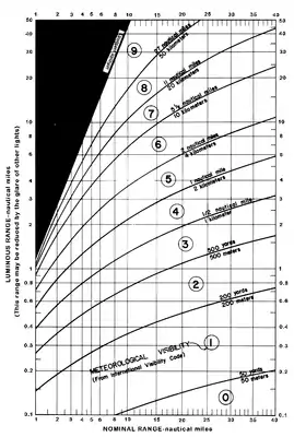 A light’s luminous range is the maximum range at which an observer can see a light under existing visibility conditions. This luminous range ignores the elevation of the light, the observer’s height of eye, the curvature of the Earth, and interference from background lighting. It is determined from the known nominal range and the existing visibility conditions. The nominal range is the maximum distance at which a light can be seen in weather conditions where visibility is 10 nautical miles.