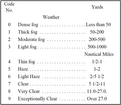 The U.S. Coast Guard Light List usually lists a light’s nominal range. Use the Luminous Range Diagram shown in the Light List and Figure 407a to convert this nominal range to luminous range. Remember that the luminous ranges obtained are approximate because of atmospheric or background lighting conditions. To use the Luminous Range Diagram, first estimate the meteorological visibility by the Meteorological Optical Range Table, Figure 407b. Next, enter the Luminous Range Diagram with the nominal range on the horizontal nominal range scale. Follow a vertical line until it intersects the curve or reaches the region on the diagram representing the meteorological visibility. Finally, follow a horizontal line from this point or region until it intersects the vertical luminous range scale.