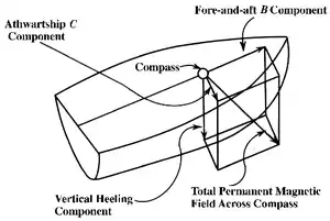 Athwartship component of permanent magnetic field Induced magnetism in unsymmetrical vertical iron port or starboard of compass. |