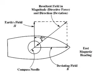 As previously explained, a ship’s magnetic influence will generally cause the compass needle to deflect from the magnetic meridian. This angle of deflection is called deviation. If the north end of the needle points east of the magnetic meridian, the deviation is easterly; if it points west of the magnetic meridian, the deviation is westerly.